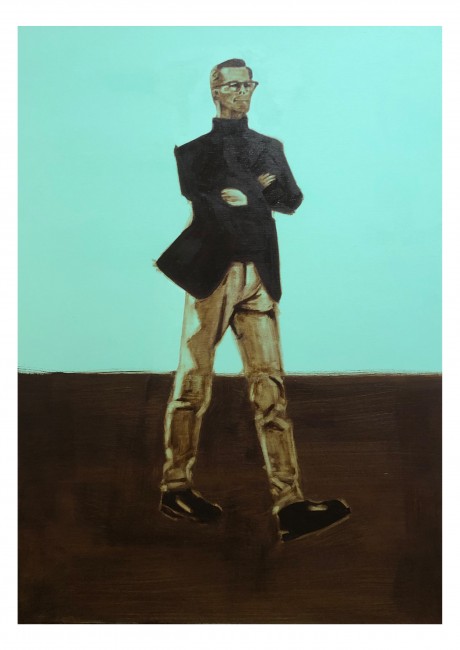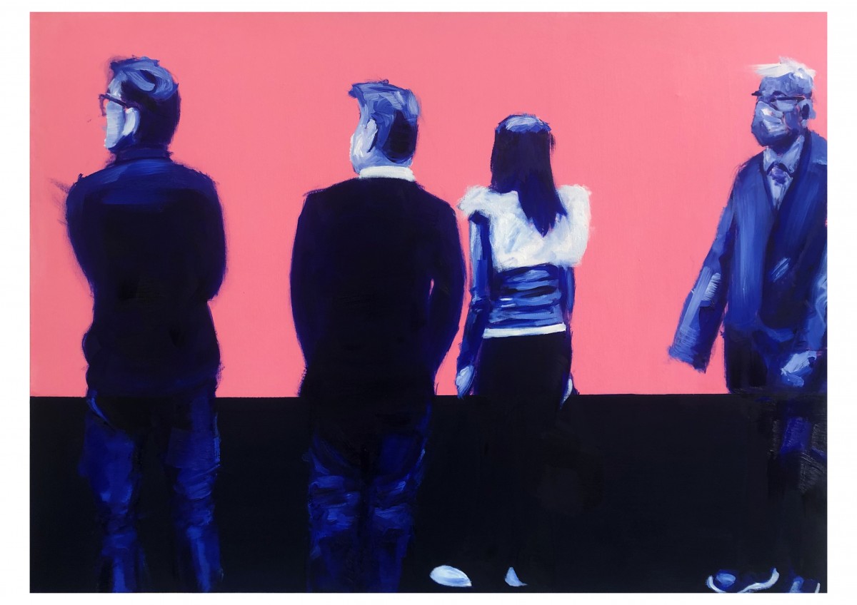 Through the medium of paint he analyses this notion and presents the stereotypical figures that you may see at these events within a formalist, abstract setting. Whitewood places a focus on monochromatic colour combinations that he derives from architecture and interior design and the structure of his figures which he constructs with large, loose brush strokes to abstract the figures. This turns them into characters navigating the space and shines a light on the people over the art that would usually be surrounding them, which urges the viewer to examine how they present themselves within the art world.